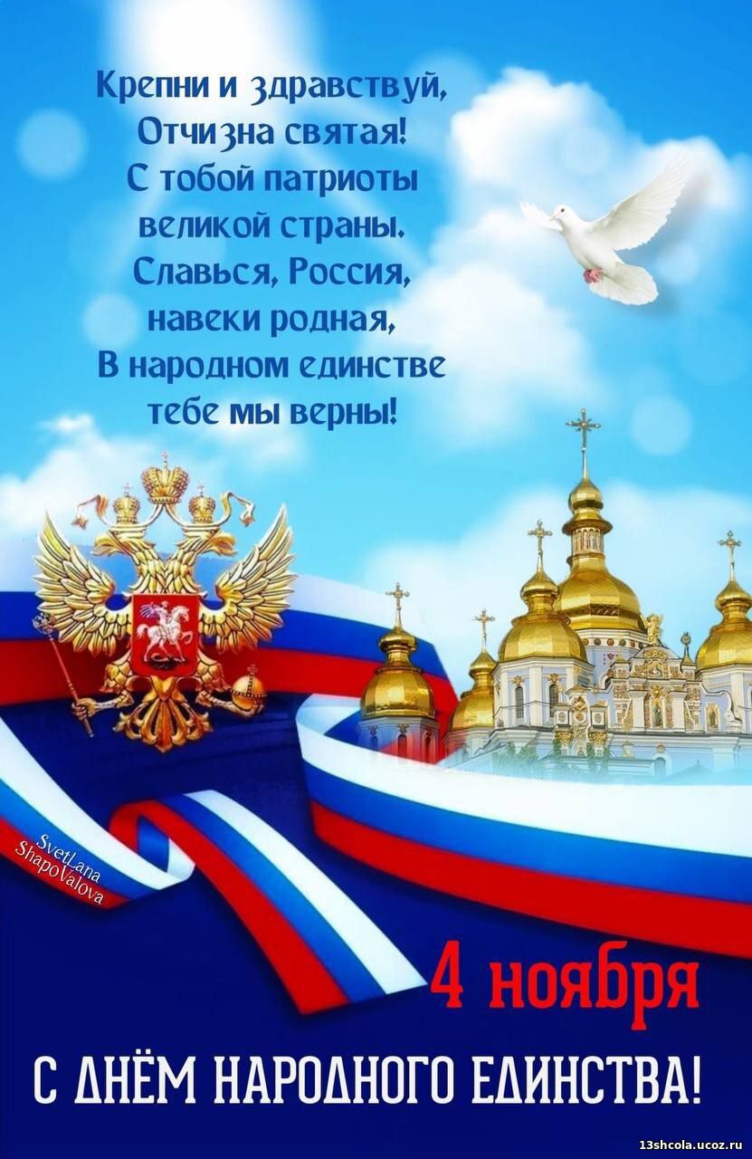 Сегодня мы отмечаем важный праздник – День народного единства. В этот день, воссоединяясь в едином порыве, мы вспоминаем о том, как наши предки стояли на защите единства нашей Родины, о том, как силы духа и сплоченности помогли преодолеть тяжёлые испытания. Этот день напоминает нам о важности патриотизма, взаимопонимания и уважения друг к другу. Мы все – часть великого многонационального народа, который объединяет нас, несмотря на различия. Именно наша друж